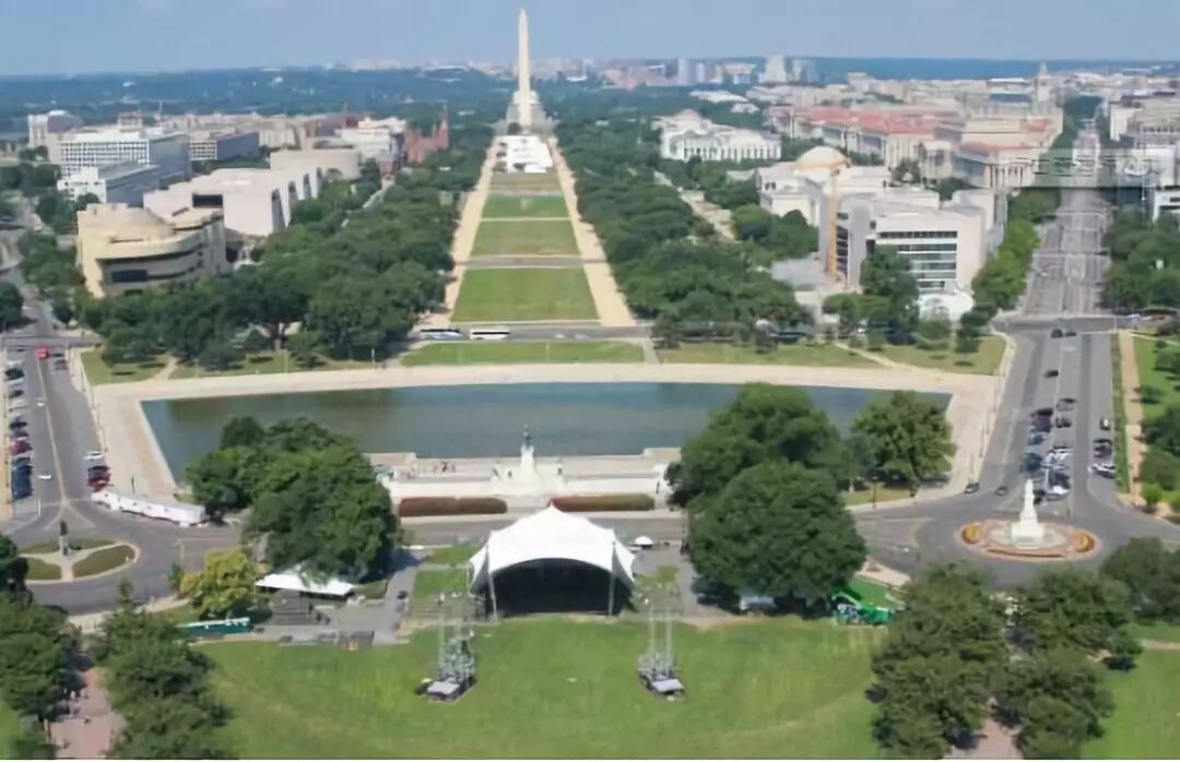 华盛顿纪念碑竖立在城市的中轴线上,前面一汪小型池塘。大概上相当于临沂的“五洲湖”。