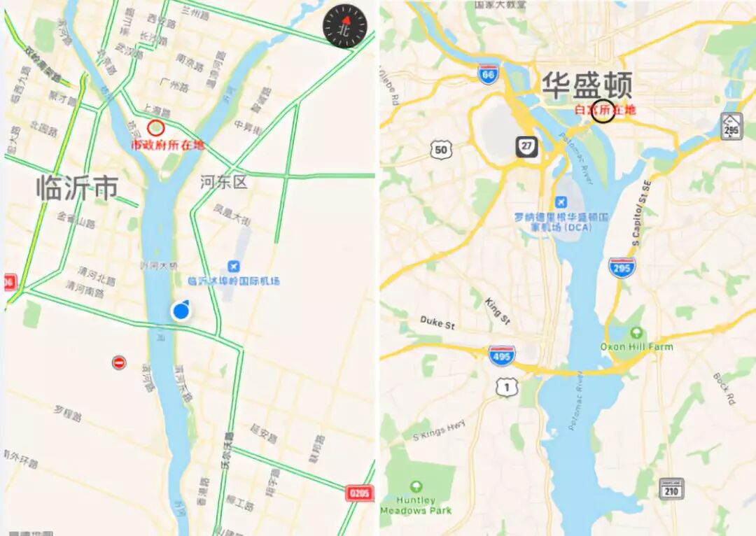 进一步通过道路交通地图比对后,整个城市的布局更是多处雷同。比如白宫的所在地和临沂市市政府的位置几乎相同,都是在三河交汇处的三角洲附近。三河交汇处的大桥布局、隧道位置也是几乎完全一致。地图下方,金九路(沂河路)大桥与华盛顿495号大桥也是同出一辙,在整个城市布局中贯通东西,横穿而过。也许因为是东西半球的原因,华盛顿机场位置则与临沂的位置相反,华盛顿的沿河左侧而建,临沂则沿右侧建设。沿河两测同样是规划了大量景观、公园和沿河快速车道。